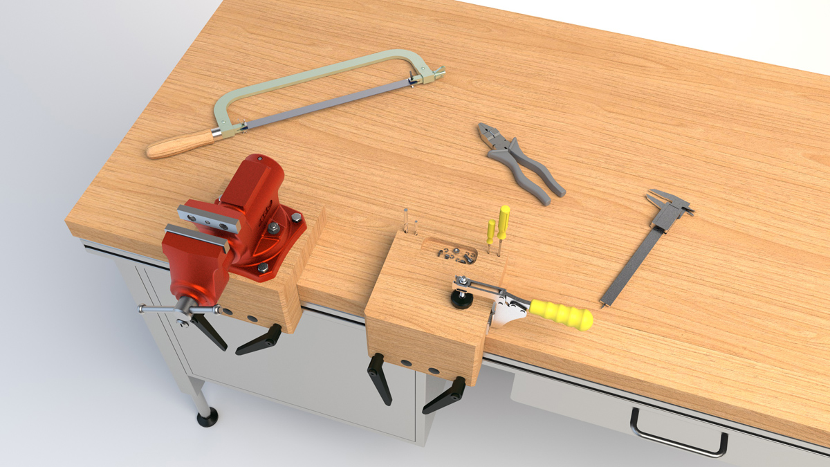 Stůl muže být doplněn  svěrákem, kovovou skříňkou a zásuvkou.