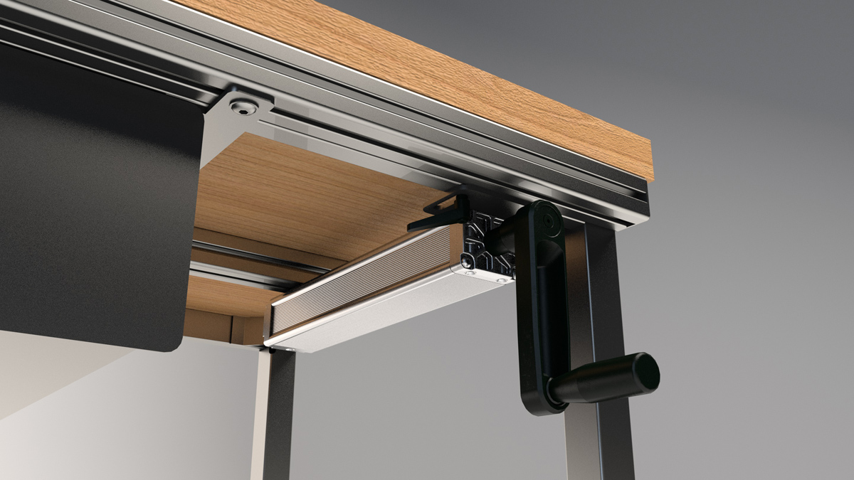 Stůl je výškově stavitelný pomocí hydraulického systému, který umožňuje plynulé nastavení výšky stolu v rozsahu 64-84cm. Nastavení výšky pracovní plochy je rychlé, pohodlné  a není potřeba žádného nářadí. Nosnost stolu je 200kg.